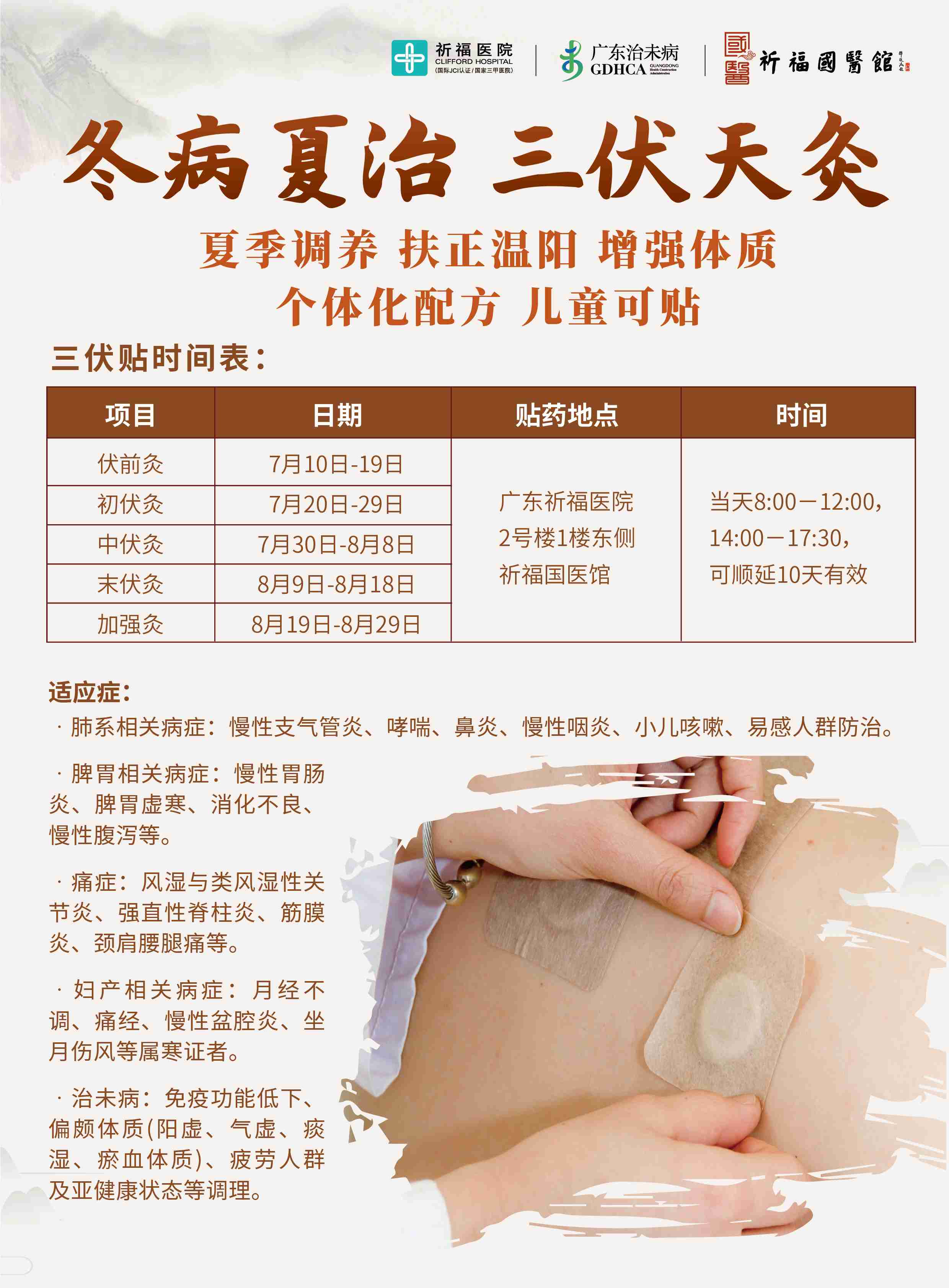 预约方式:关注【广东祈福医院】公众号,私信回复【三伏贴】,在线预约。
