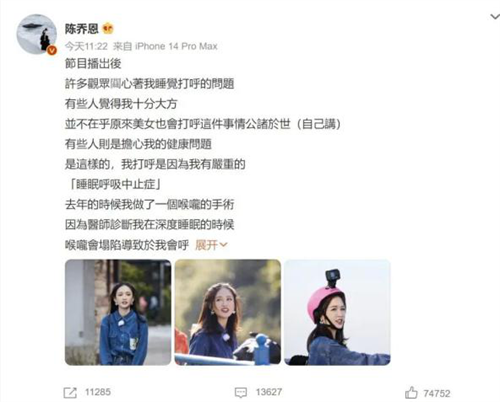 女星陈乔恩也曾因睡觉打鼾登上热搜,陈乔恩表示自己患有严重的睡眠呼吸中止症,如果是深度睡眠的话一个小时会终止呼吸25次,每次大概会长达50秒以上,因而不得不做手术。