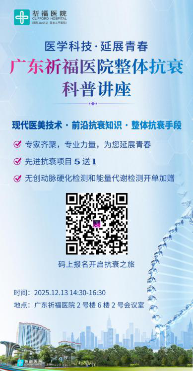 为何人的体能、衰老速度会差别这么大?该如何科学应对衰老进程?12月13日,医学科技,延展青春——2025年广东祈福医院抗衰老医学中心大型科普系列活动将火热开启,广东祈福医院副院长区俊文、整形美容中心首席顾问胡志奇教授、妇产中心主任郭钰珍等多位专家将带您一同解码抗衰奥秘。大咖亲临开讲,干货不断,机会难得,赶快报名!