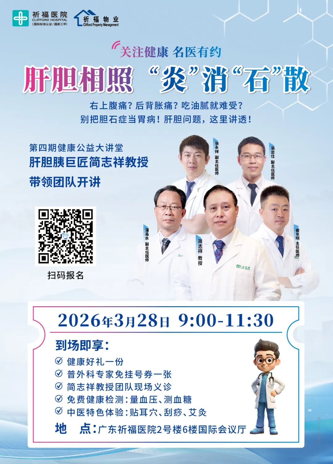 如果您或家人也常有肝胆困扰,3月28日(周六)上午,广东祈福医院将举办第四期健康公益大讲堂,全国知名肝胆胰外科专家简志祥教授率领“名医天团”,现场为您一次讲透胆石症的防治知识,到场还有多重健康好礼相送。